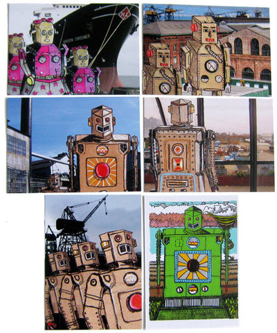 March 21, 2010 # 4:23 pm # Products # 3 Comments #PIPEROIDS paper robots have long ruled the robot block here at Modern Mouse, but they’re now joined by a new friend — Ritz the Robot from Robot in the City! Ritz (seen here talking to Hammer Rose and Muscle Joe) and the PIPEROIDS have been getting to know each other since Ritz arrived at the store yesterday in the hands of Alexander Shen (whom we’re ever so grateful to fun and faithful Modern Mouse customer Shannon for introducing us to)!